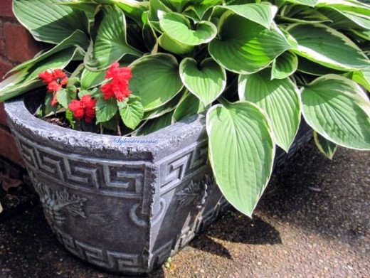 Of course, I always plant petunias in a few pots, but each year I select a variety of annuals to plant. This year I chose African Daisies, a Dahlia, Marigolds, and a Spangled Star Dianthus. I also have 2 hosta plants in separate concrete containers. They flourish in their containers and return early every spring.