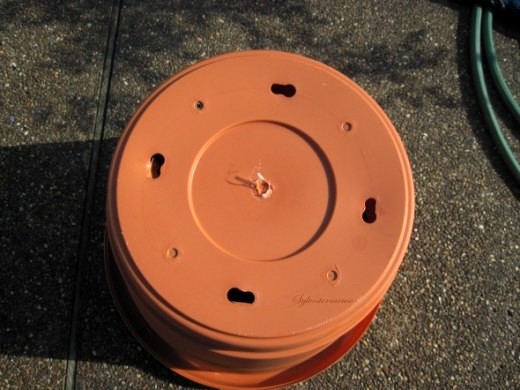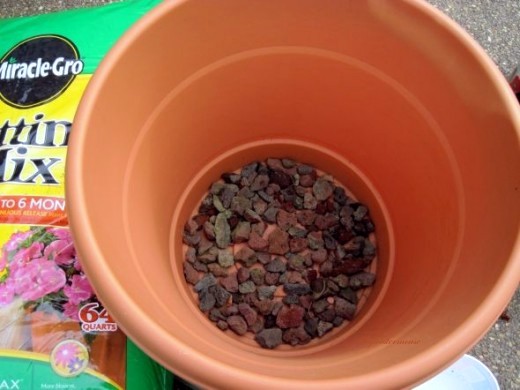 If holes are not pre-drilled in the containers, I start by drilling 3 holes in the bottom of the pot. I always start with a layer of rocks in the bottom of my containers to help drainage and to avoid root rot.