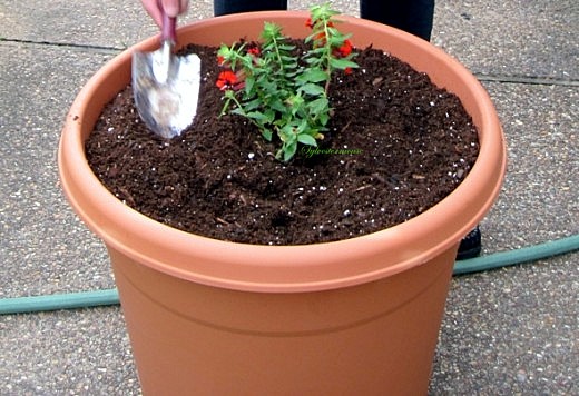 Then I fill the pot with Miracle-Gro potting soil and plant my flowers.