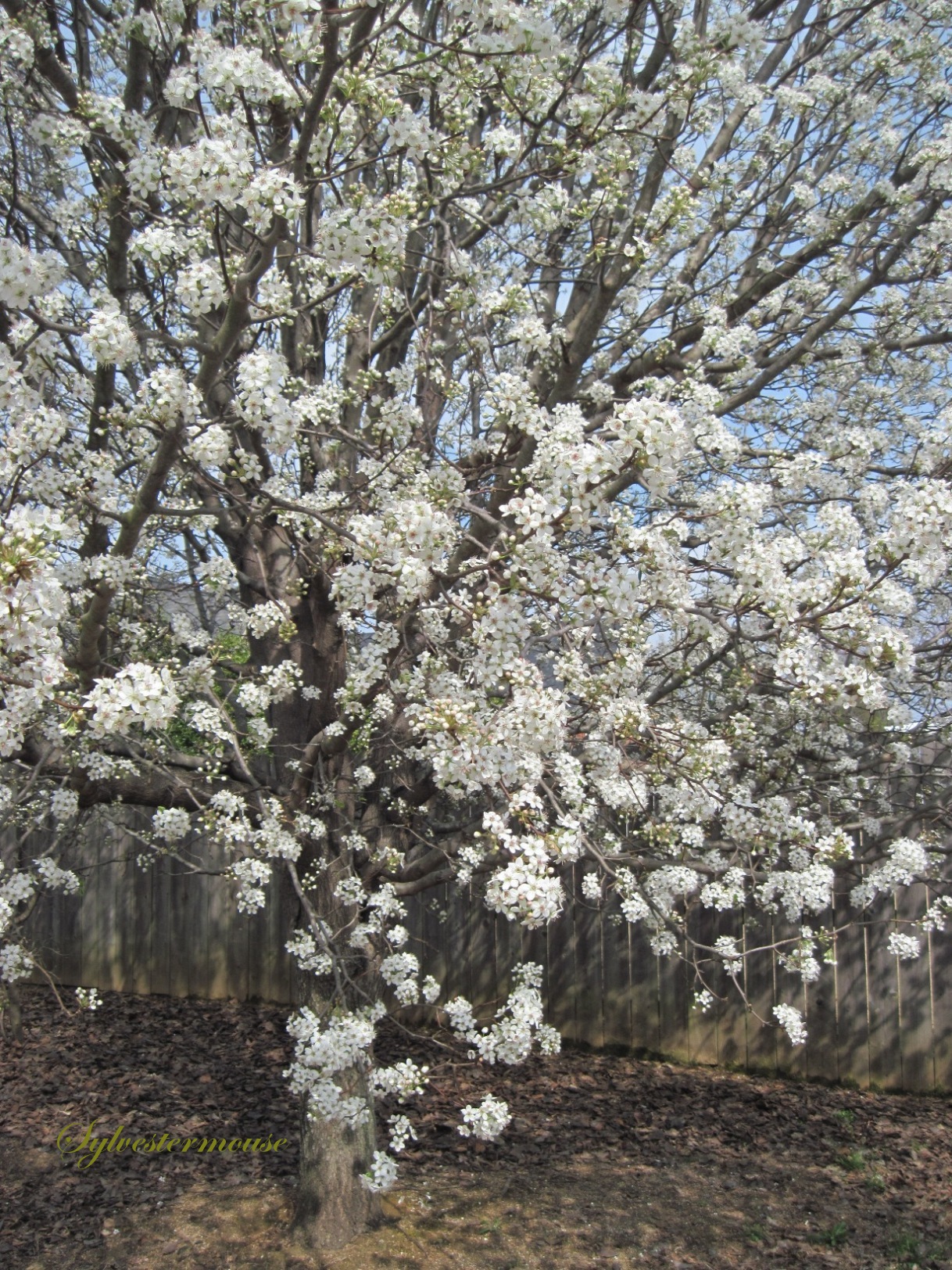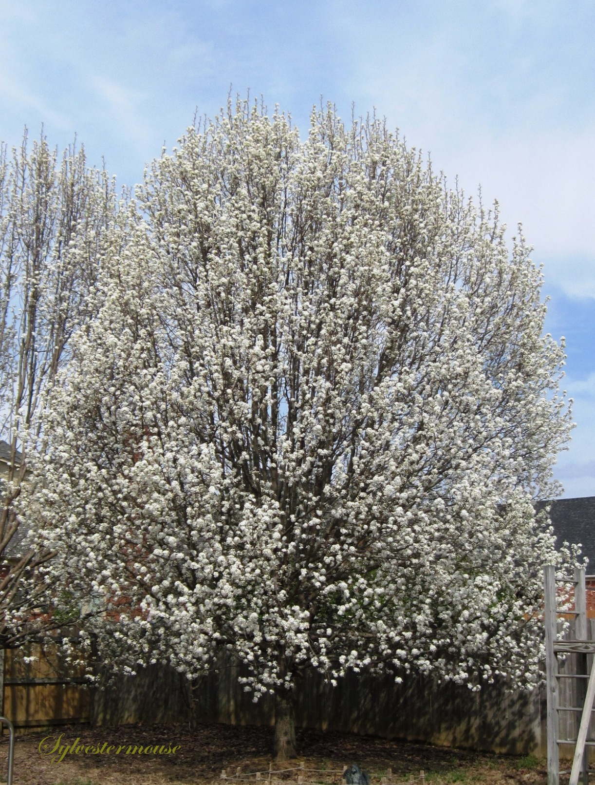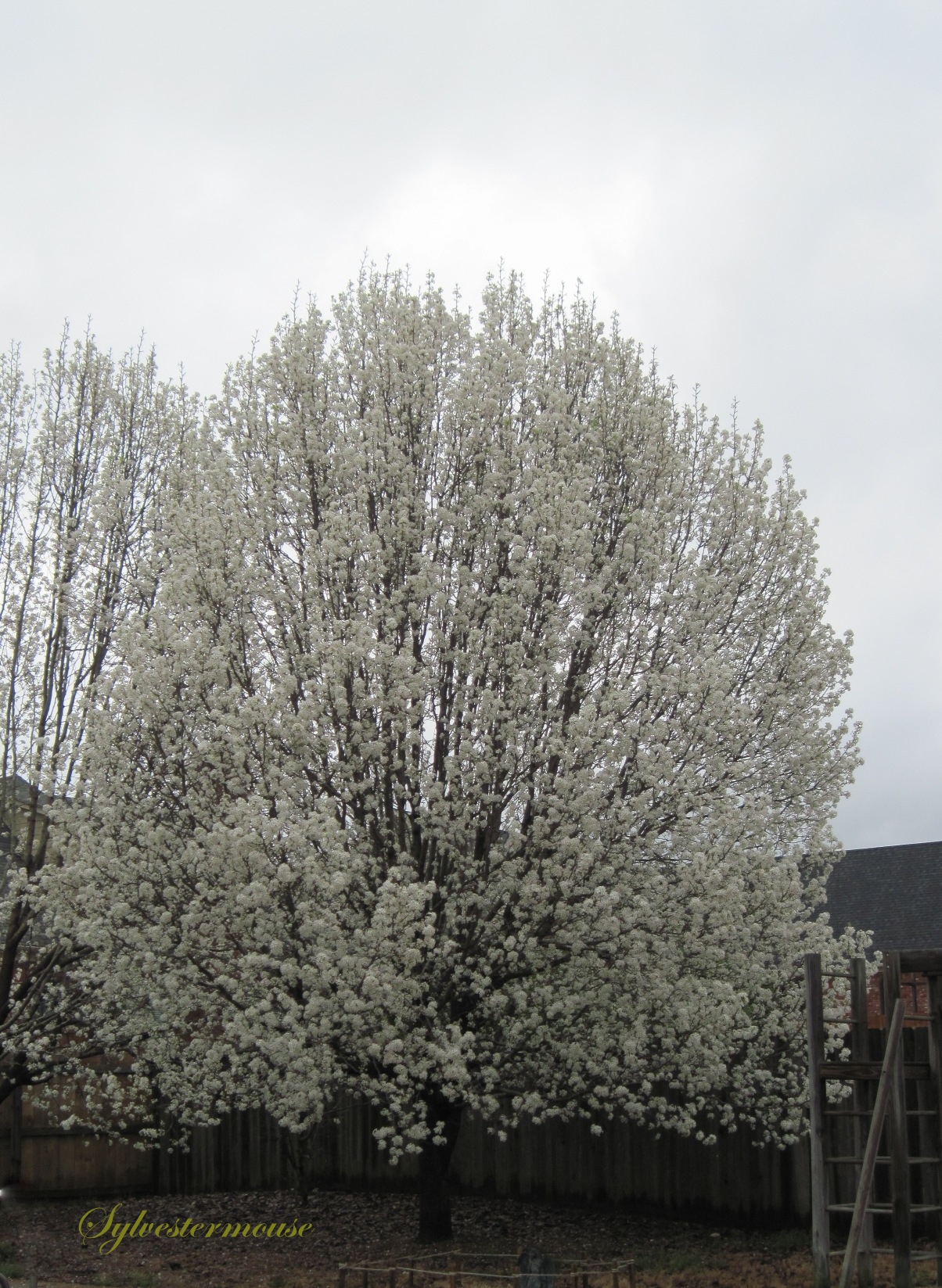 My backyard is graced with two Flowering Bradford Pear Trees. We call the Flowering Pear Trees our “gentle giants” because they are huge, but when the wind blows they sway like graceful ballerinas.
